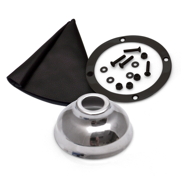 American Shifter’s boot kits include all you need to dress up your shifter or emergency brake handle. Each kit includes a real Naugahyde boot, trim ring, chrome cap and mounting hardware.